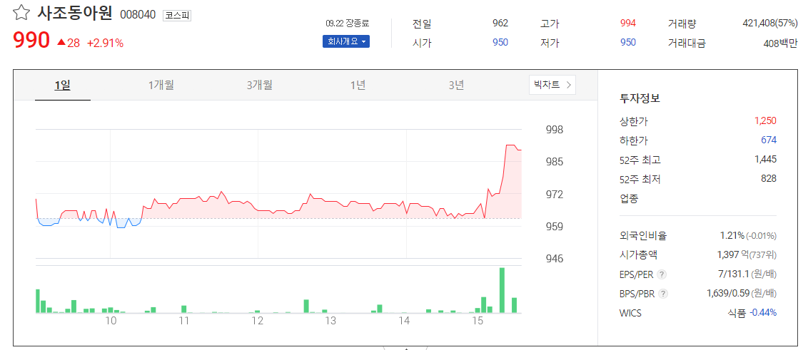 사조동아원 현재 주가는 962원이며 전일 대비 -14원의 모습을 보이고 있습니다.