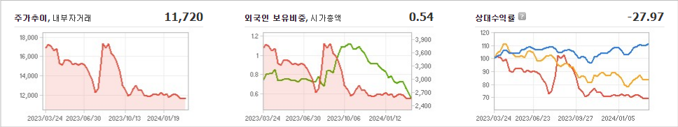 잇츠한불의 현재 주가는 11,720원이며 전일 대비 -4.01원의 변동을 보이고 있습니다. 주주 현황을 살펴보면 임병철 외 5인이 지분의 61.59%를 소유하고 있습니다. 잇츠한불은 개인 생활용품 기업으로서, 현재 주가는 11,720원입니다. 시가 총액은 2557억 원이며 발행 주식수는 21,929,315주입니다. 외국인 보유 비중은 0.54%이며, 장중 거래량은 10,728주를 기록했습니다. 또한, 매출액은 1,041억 원을 달성했습니다.