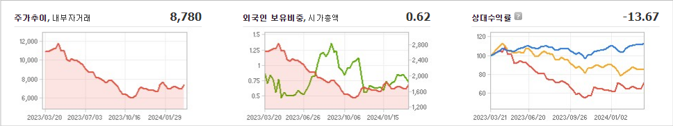 그린케미칼의 현재 주가는 8,780원이며 전일 대비 -13.67원의 변동을 보였습니다. 주주현황을 살펴보면 건덕상사(외 4인)가 지분의 59.83%를 소유하고 있습니다. 그린케미칼은 화학 기업으로, 현재 주가는 8,780원입니다. 시가 총액은 2088억 원이며 발행 주식수는 24,000,000주입니다. 외국인 보유 비중은 0.62%이며 장중 거래량은 15,341,195주입니다. 매출액은 2,823억 원으로 기록되었습니다.