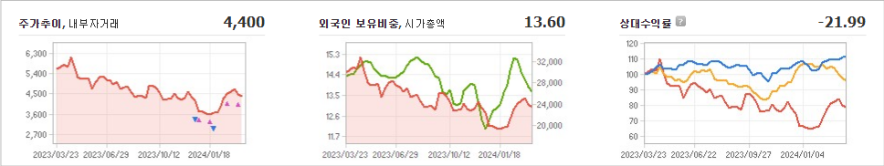 팬오션의 현재 주가는 4,400원이며 전일 대비 -2.00원의 변동을 보이고 있습니다. 주주 구성을 살펴보면 하림지주(외 12인)이 지분의 54.92%를 소유하고 있습니다. 팬오션은 해상운수 기업으로, 현재 주가는 4,400원입니다. 시가 총액은 2조3708억 원이며 발행 주식수는 534,569,512주입니다. 외국인 보유 비중은 13.60%이며, 거래량은 2,926,956주를 기록했습니다. 또한, 매출액은 43,610억 원을 달성했습니다.