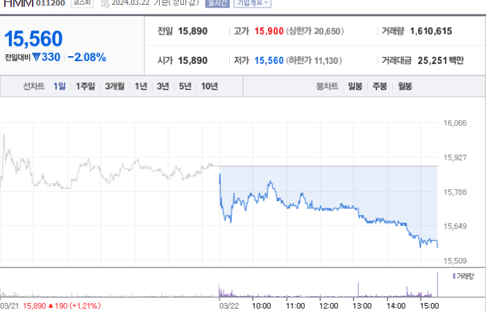 HMM의 현재 주가는 15,890원이며 전일 대비 -16.63원의 변동을 보이고 있습니다. HMM의 주주현황을 살펴보면 29.20%의 지분을 소유하고 있습니다. HMM은 해상운수 기업으로 주가는 15,890원입니다. 시가 총액은 10조7215억 원이며 발행 주식수는 689,039,496주입니다. 외국인 보유 비중은 11.00%이고, 장중 거래량은 1,166,320입니다. 매출액은 84,010억 원입니다.