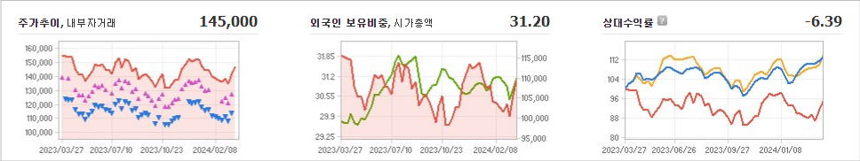 삼성전기의 현재 주가는 145,000원이며 전일 대비 -4.16원의 변동을 보여주고 있습니다. 삼성전기의 주주 구성은 삼성전자(외 5인)이 지분의 23.83%를 소유하고 있습니다. 삼성전기는 전자 장비 및 기기 기업으로 장중 기준으로 주가는 145,000원입니다. 시가 총액은 10조8978억 원이며 발행 주식수는 74,693,696주입니다. 외국인 보유 비중은 31.20%이며 장중 거래량은 223,285주를 기록했습니다. 또한, 매출액은 89,094억 원을 달성했습니다.