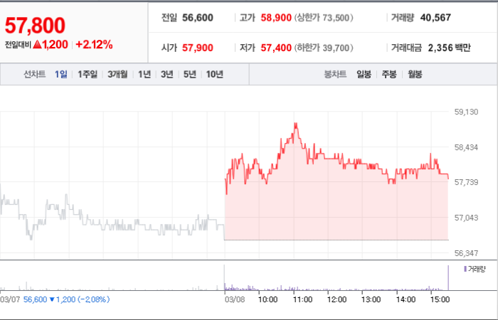 에스원은 현재 주가가 57,800원이며 전일 대비 -1.37원 하락한 상태입니다. 주주현황을 살펴보면, 삼성SDI(외 5인)이 지분의 25.65%를 소유하고 있습니다. 에스원은 상업서비스 기업으로, 장중 기준으로 주가는 57,800원입니다. 시가 총액은 2조1964억 원이며 발행 주식수는 37,999,178주입니다. 외국인 보유 비중은 55.07%이며, 장중 거래량은 65,568을 기록했습니다. 또한, 매출액은 19,267억 원을 달성했습니다.
