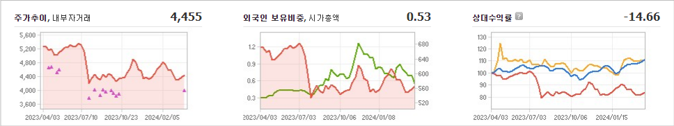 삼일씨엔에스의 현재 주가는 4,455원이며 전일 대비 -14.66원의 변동을 보이고 있습니다. 주주현황을 살펴보면 삼일홀딩스(외 3인)이 지분의 55.90%를 소유하고 있습니다. 삼일씨엔에스는 건축소재 기업으로, 현재 주가는 4,455원입니다. 시가 총액은 564억 원이며 발행 주식수는 12,731,947주입니다. 외국인 보유 비중은 0.53%이며, 거래량은 10,527주를 기록했습니다. 매출액은 2,164억 원으로 달성했습니다.