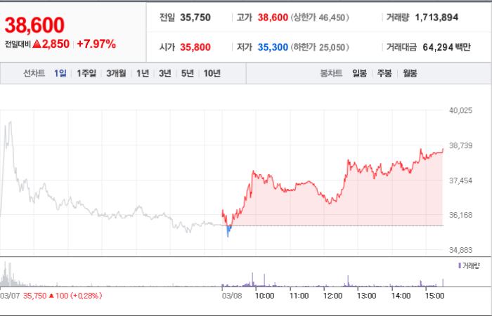 한올바이오파마의 현재 주가는 38,600원이며 전일 대비 상승세를 보이고 있습니다. 한올바이오파마의 대주주인 대웅제약(외 5인)은 지분의 32.37%를 소유하고 있습니다. 한올바이오파마는 제약 기업으로 시장 오픈 시점에서 주가는 38,600원입니다. 한올바이오파마의 시가 총액은 2조165억 원이며 발행 주식수는 52,240,638주입니다. 외국인 보유 비중은 6.13%이며 거래량은 1,732,017주입니다. 또한, 한올바이오파마는 매출액으로 1,349억 원을 달성했습니다.