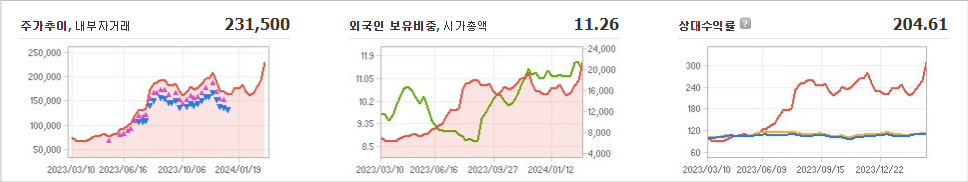 효성중공업은 현재 231,500원의 주가를 보이고 있으며 전일 대비 원의 모습을 보이고 있습니다. 주주현황을 살펴보면 효성(외 12인)이 지분의 54.62%를 소유하고 있습니다. 효성중공업은 기계 기업으로 장중 기준으로 주가는 231,500원입니다. 시가 총액은 2조1586억 원이며 발행 주식수는 9,324,548주입니다. 외국인 보유 비중은 11.26%이며 장중 거래량은 93,640을 기록했습니다. 또한, 효성중공업은 매출액으로 30,086억 원을 달성했습니다.