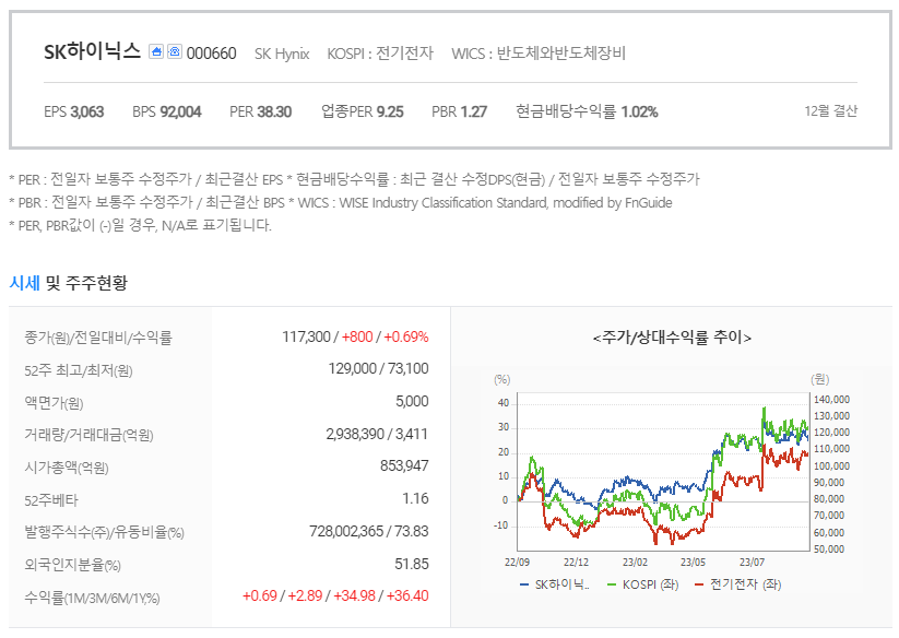 SK하이닉스 현재 주가는 117,300원이며 전일 대비 원의 모습을 보이고 있습니다. SK하이닉스의 주주현황을 살펴보면 에스케이스퀘어(외 9인)가 지분 20.07%를 소유하고 있습니다. SK하이닉스는 반도체 및 관련장비 기업으로 장중 기준으로 주가는 117,300원입니다. 삼성전자의 시가 총액은 85조 3947억 원이며 발행 주식수는 51.85주입니다. 외국인 보유 비중은 2,938,386%이며 장중 거래량은 728,002,365를 기록했습니다. 매출액은 123,940억 원, 영업이익은 68,094억 원을 달성했습니다. EPS는 -10,703원이며 SK하이닉스 주식 배당수익률은 1.60%입니다.